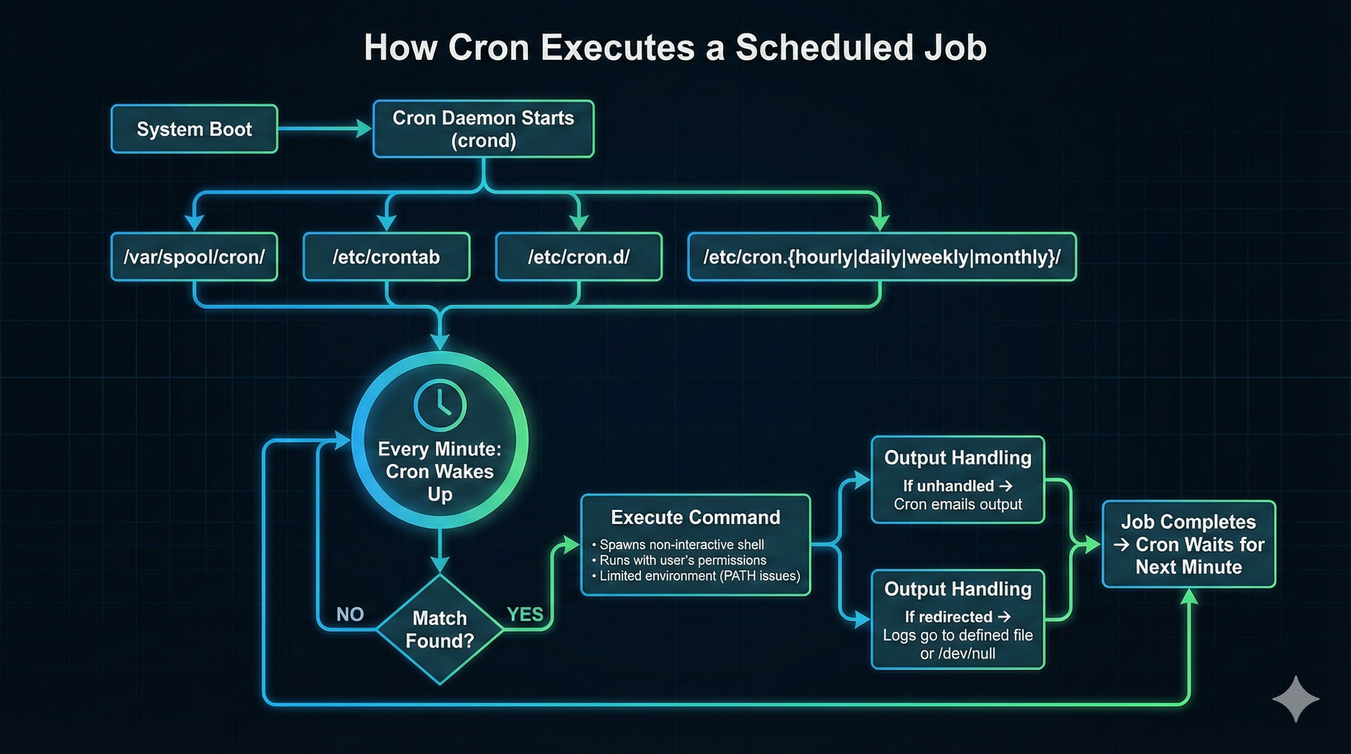 cronddaemon starts at system boot and runs persistently in the background. - Reading Sources: Every 60 seconds, Cron scans multiple directories: